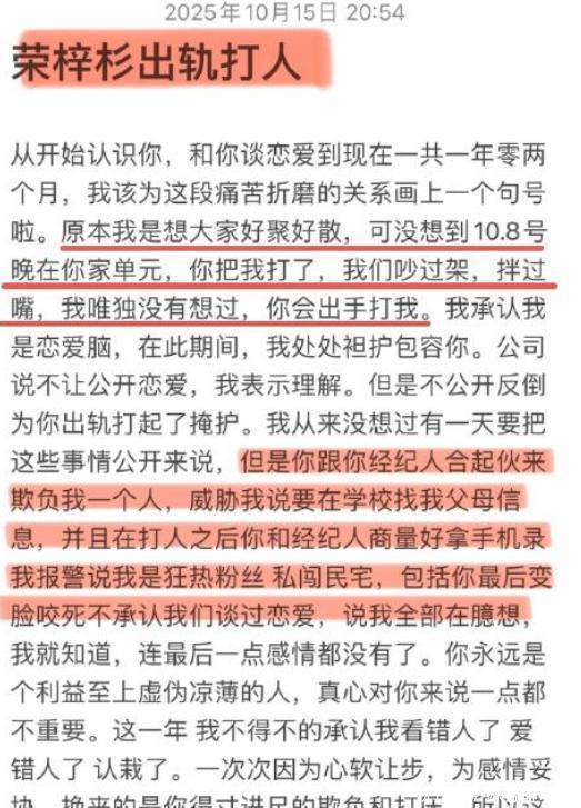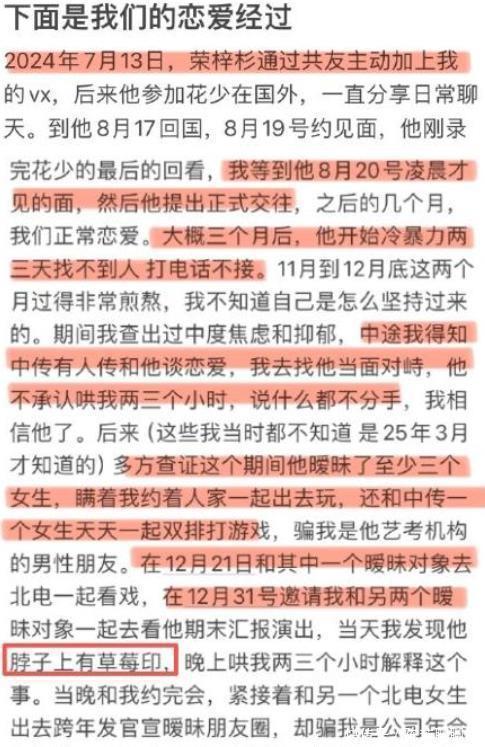 明星之间的爱恨情仇昨晚,于中戏刚刚毕业的李禹熹在网上发了一篇长长的帖子。全文都是在揭露荣梓衫那些不好的行为,一点好话都没有。至于男方嘛,1999年出生,曾在2020年出演悬疑剧《隐秘的角落》,凭借这部剧挺出了名。
