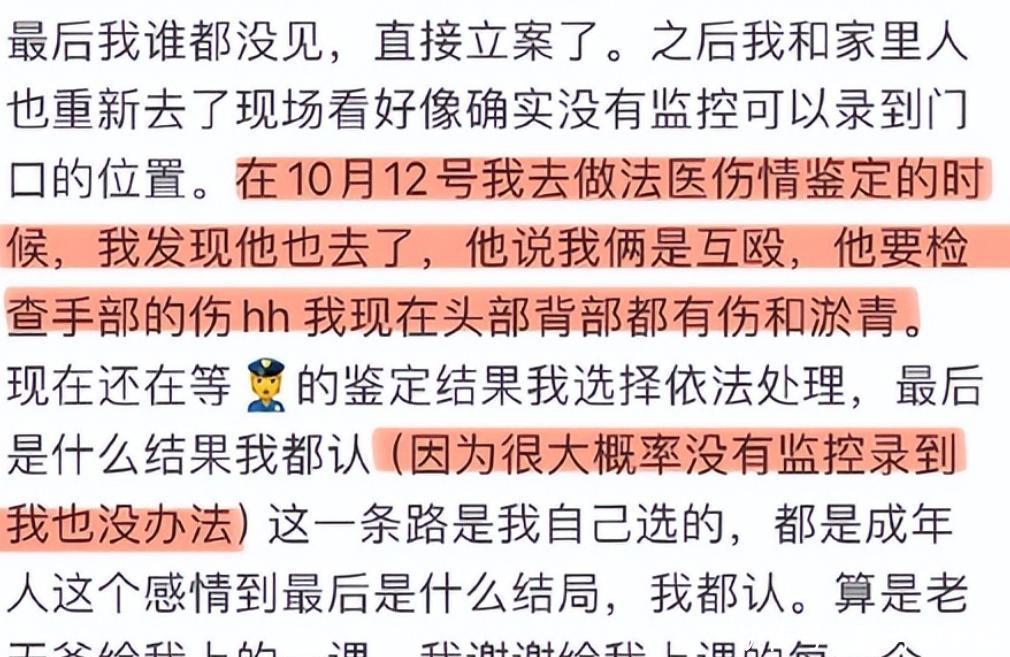 立案调查在10月12号那天,李禹熹去医院做伤情鉴定,幸梓杉也一块儿跟着一同去了。挺离奇的,这回男方坚称两人是互相打架。之前提到的私闯民宅这事儿,现在就当没发生过一样,什么都不提。