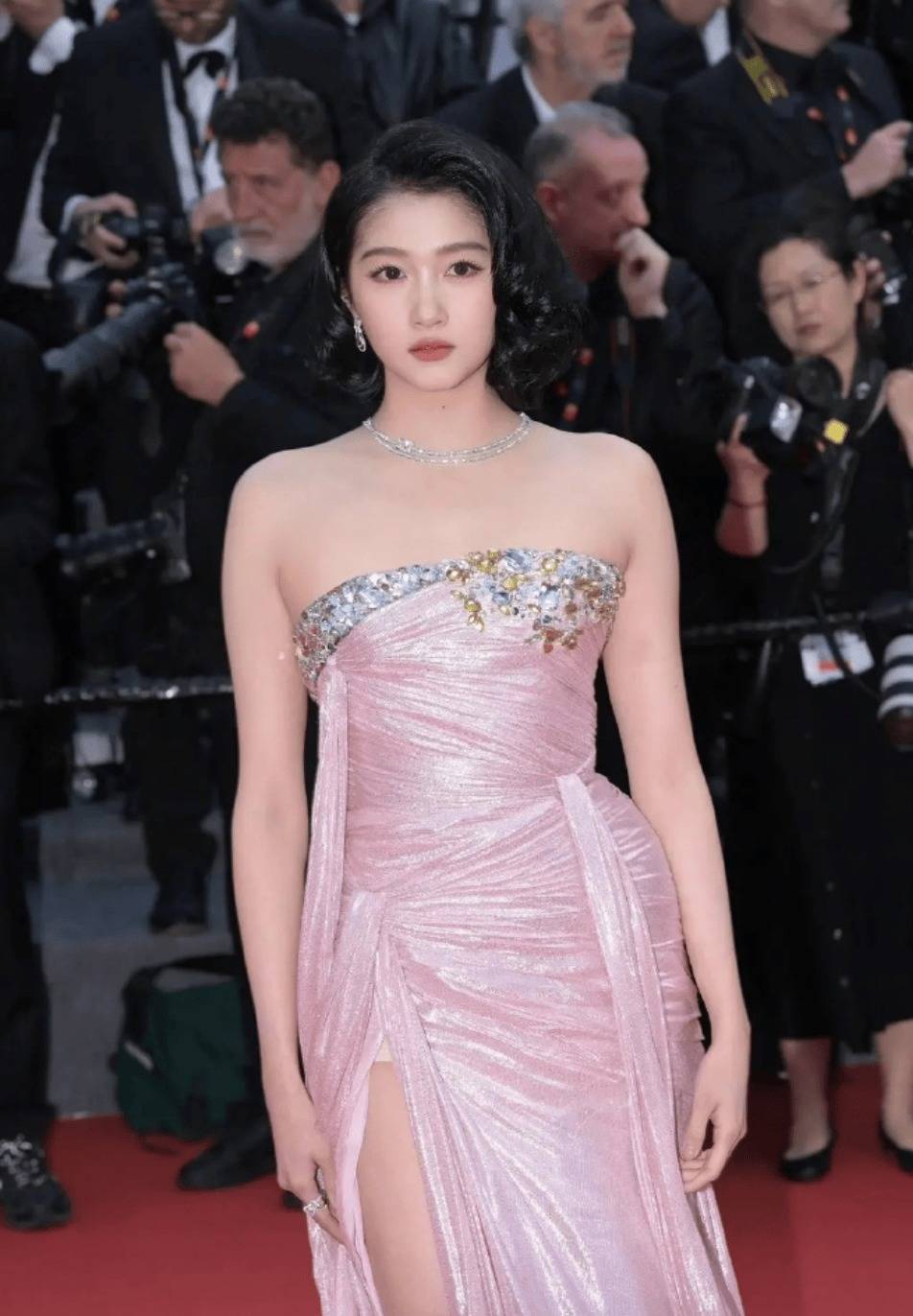 说起来这已经不是关晓彤第一次因为身材上热搜了。作为娱乐圈有名的高个子女星,她173cm的身高配上大骨架,本来是天生的衣架子,可偏偏总在造型上栽跟头。这次尼斯活动穿的浅粉色亮面礼服,简直是把所有缺点都摆在了明面上:抹胸设计让宽肩厚背无所遁形,亮面材质又放大了腰部线条,再加上裙摆层层叠叠的褶皱,整个人看起来比实际胖了不止十斤。有网友吐槽说像“刚从影楼借来的衣服”,还有人翻出她之前穿运动装的照片对比:“私下明明很瘦,怎么一到正式场合就翻车?”